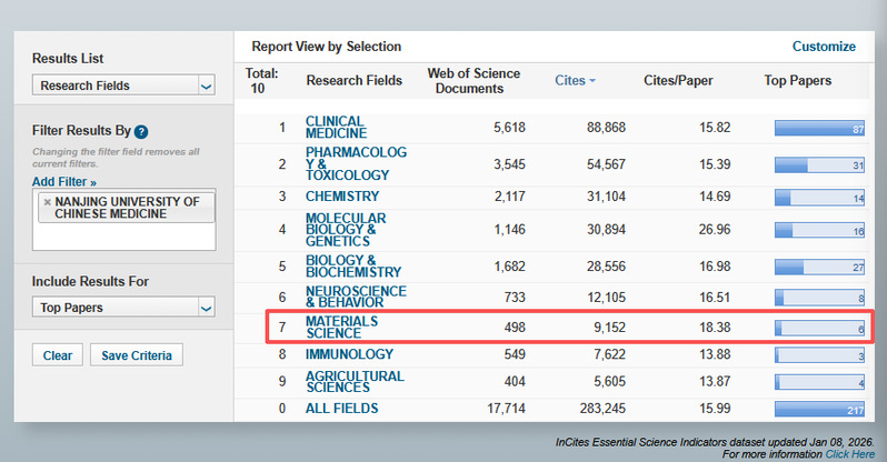 1月8日,科睿唯安(Clarivate Analytics)发布的最新基本科学指标(Essential Science Indicators,ESI)数据显示,我校材料科学学科(Materials Science)首次进入ESI全球前1%行列。至此,我校ESI全球前1%学科数在全国中医药院校已率先增至9个,分别是药理学与毒理学、临床医学、化学、生物学与生物化学、神经科学与行为学、分子生物学与遗传学、农业科学、免疫学和材料科学,目前我校ESI全球前1%学科数位居全国中医药院校首位。